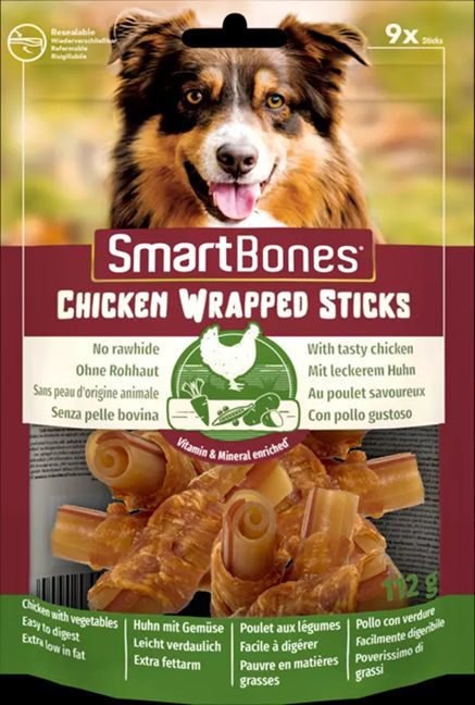 Νόστιμα μασώμενα στικ για ενδιάμεσα γεύματα: Τα SmartBones® Chicken Wrapped Sticks Mini είναι rawhides free με έναν ακαταμάχητο συνδυασμό γεύσεων: Ένα εσωτερικό στρώμα από νόστιμο κοτόπουλο και ένα εξωτερικό στρώμα με λαχανικά, όλα τυλιγμένα σε τραγανό κοτόπουλο για μια επιπλέον ξεχωριστή γεύση.