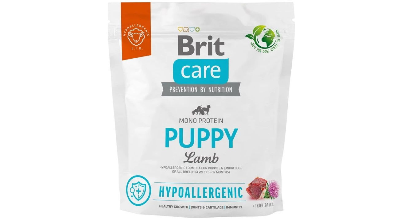 Η Brit Care Dog Hypoallergenic Puppy lamb είναι διαθέσιμη σε συσκευασίες 1kg, 3kg και 12kg για κουτάβια όλων των φυλών.